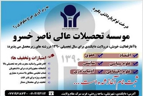 ۴- موسسه تحصیلات عالی ناصرخسرو علاوه بر موارد فوق، می تواند نویدبخش ظرفیت سازی برای نهادها و ارگان های دولتی و غیر دولتی نیز باشد. چرا که هم اکنون قریب به اتفاق کارمندان و قوای بشری همه نهادها، در حدی نیستند که به طور تخصصی کارهای مربوط و نقش های شان را ایفا کنند. به همین خاطر این موسسه می تواند نیروی کارآمد و متخصص برای جامعه و نیز سیستم اداری کشور تربیت کند.